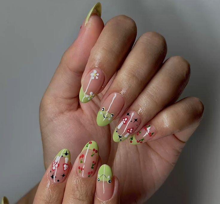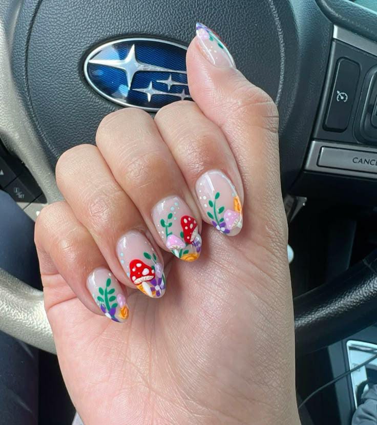 A whimsical design with clear, glossy nails decorated in bright mushrooms, leafy greens, and colorful floral details, giving off a fresh, fairy-tale meadow vibe.