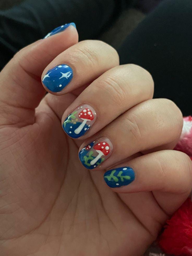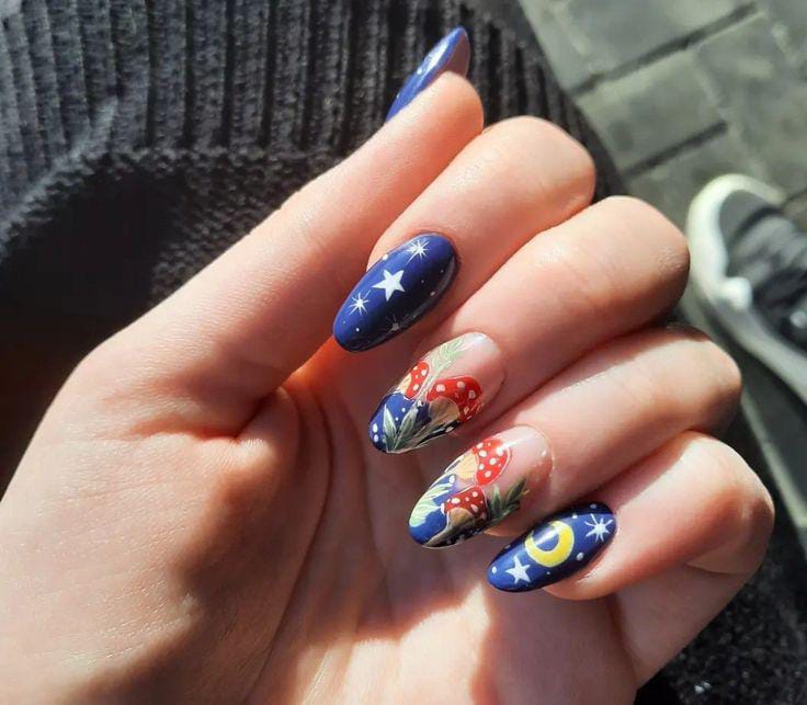 A playful combination of navy, sky blue, and burnt orange nails with detailed mushroom and leafy designs, giving a lively and artistic touch.