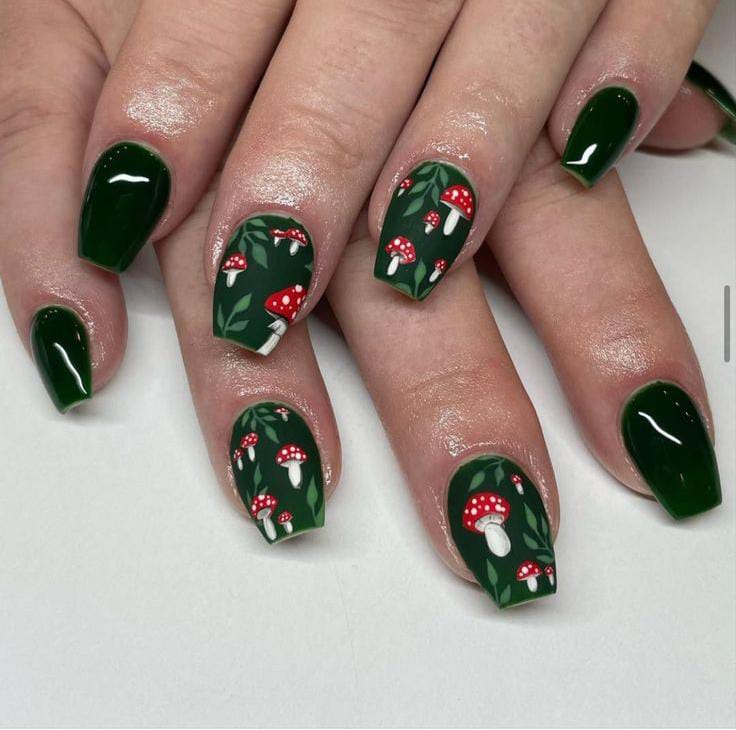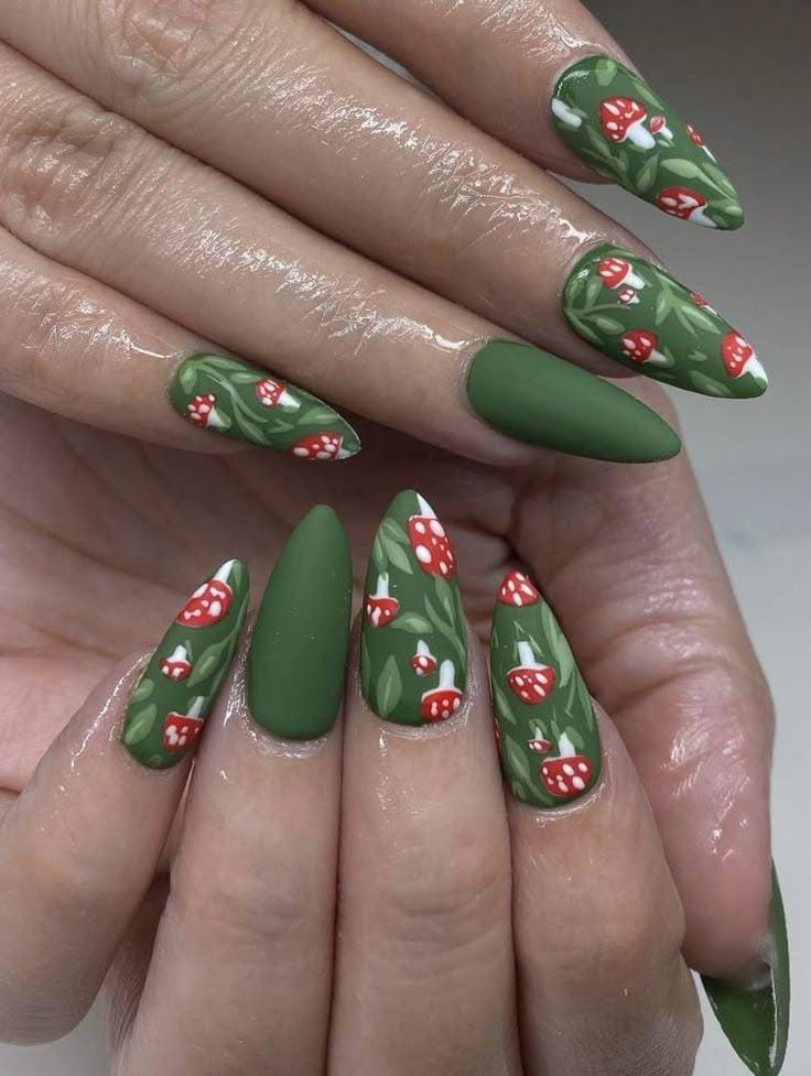 Matte green nails adorned with vibrant mushroom and leafy patterns evoke a lush, enchanted forest full of hidden wonders.
