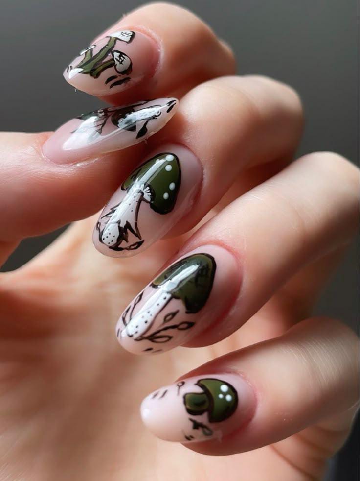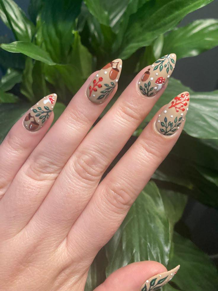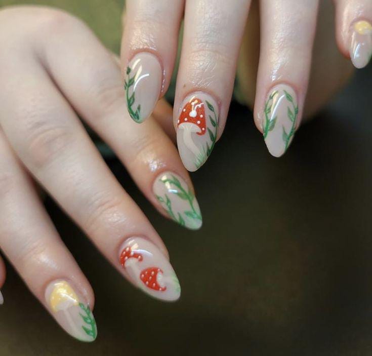 Soft nude nails with delicate mushrooms and leafy vines give a dreamy, natural look that feels light and enchanting.