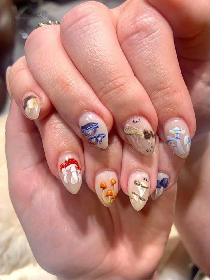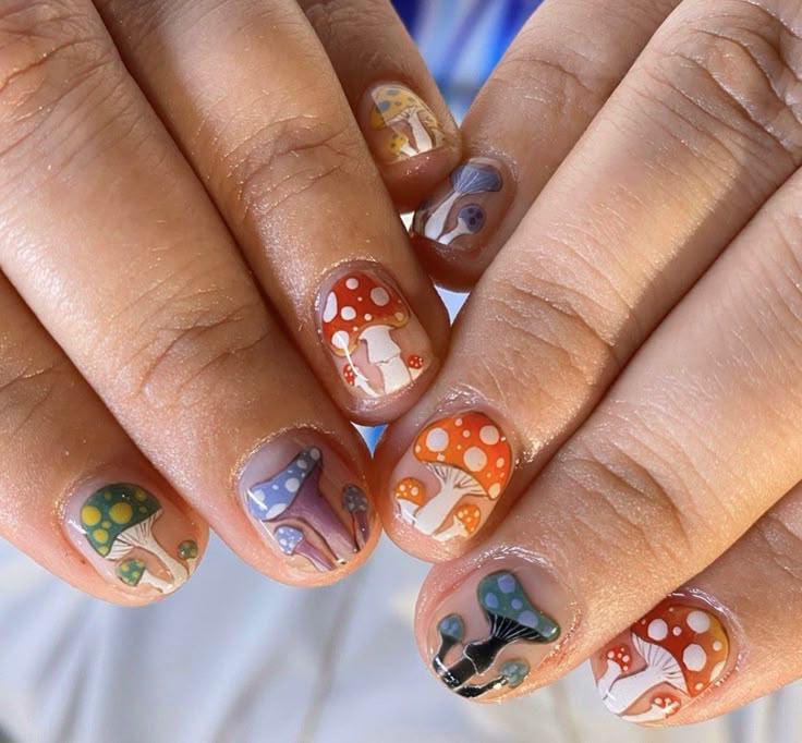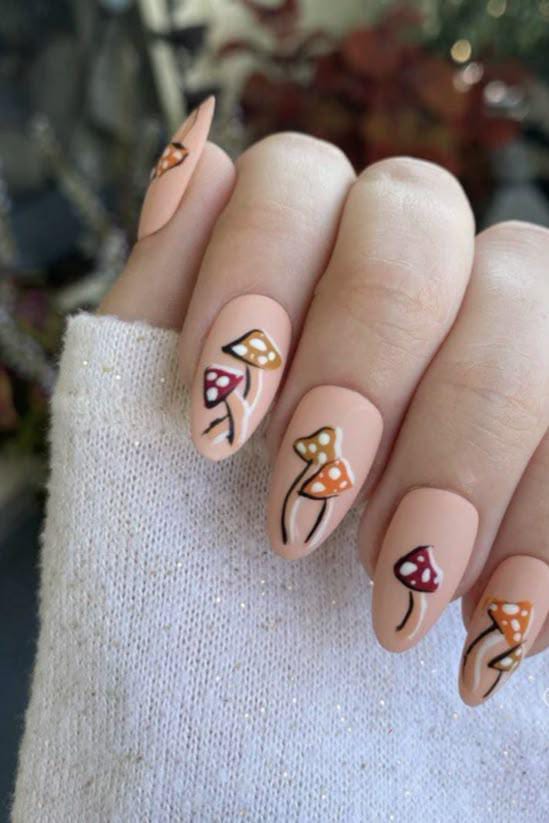 Warm nude nails adorned with mushrooms in shades of red, orange, and mustard, giving off cozy fall forest energy.