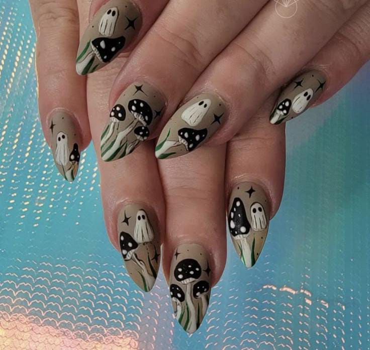 Dark mushrooms and floating little ghosts on a muted background give this look a moody, mystical charm that’s perfect for a witchy aesthetic.