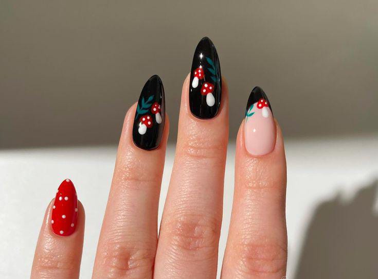 A dramatic mix of glossy black nails and bright red mushrooms makes this design stand out, balancing elegance with a playful, enchanted-forest touch.