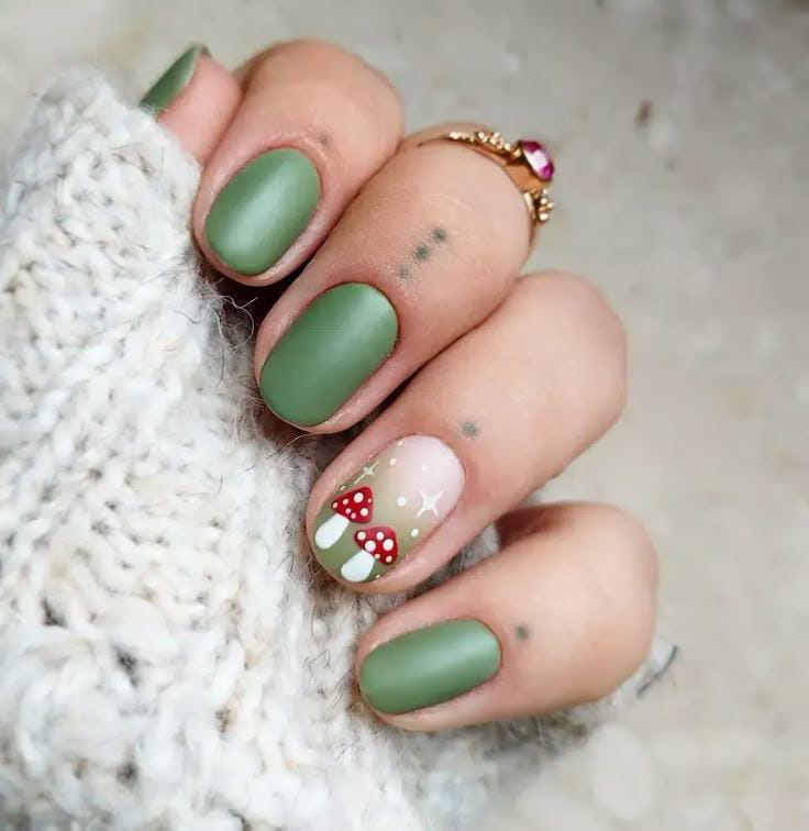 Soft matte green nails with a whimsical accent nail featuring tiny red mushrooms and white sparkles, giving off a cozy woodland vibe.