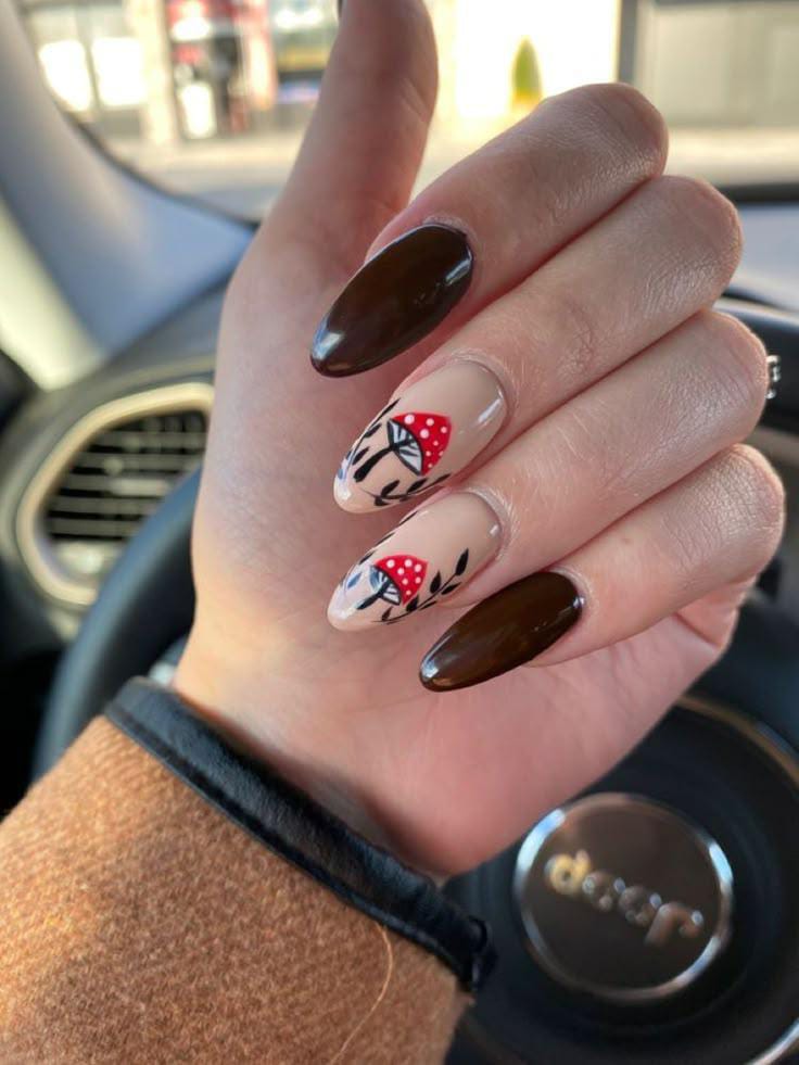 Glossy brown nails paired with nude bases decorated with red mushrooms and leafy black accents, creating a stylish earthy look.