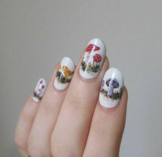 White nails painted with delicate, detailed mushrooms in different colors, resembling a dreamy fairytale forest.