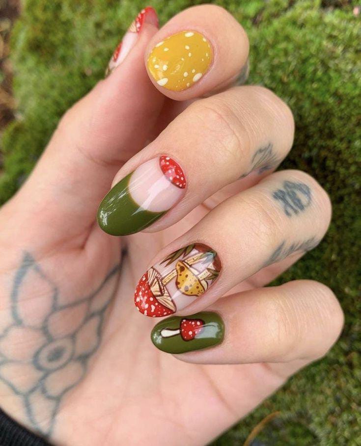 A mix of earthy green, mustard yellow, and red mushroom French tips with leafy accents, bringing a bold forest-inspired aesthetic.