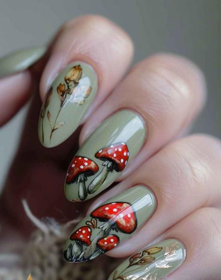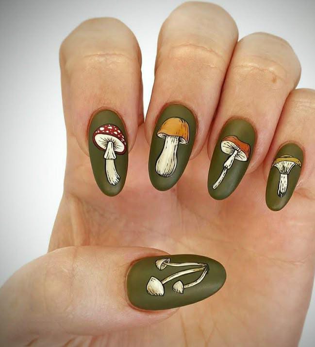 These matte olive nails feature a variety of finely detailed mushroom illustrations, each painted with natural earthy tones. The look has a rustic, botanical charm that feels cozy and inspired by nature.