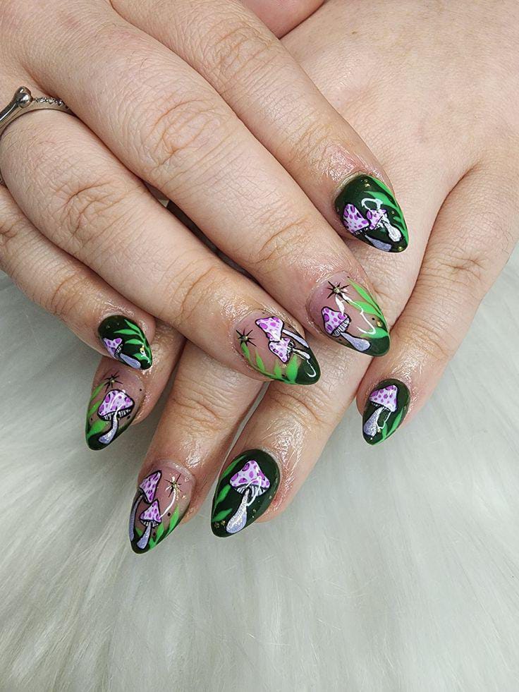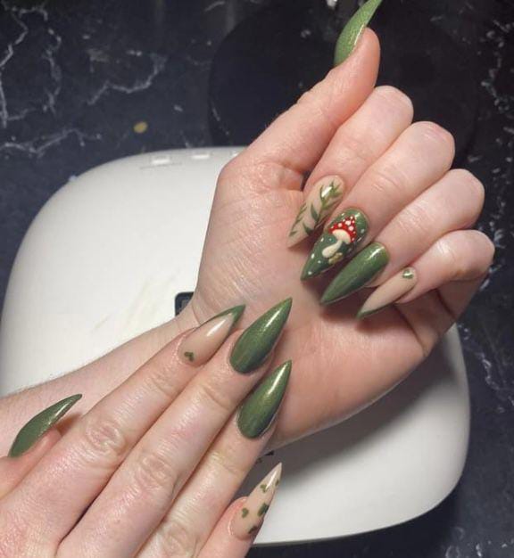 Deep green metallic nails paired with leafy accents and bold mushroom art create a mystical woodland-inspired look with a touch of elegance.