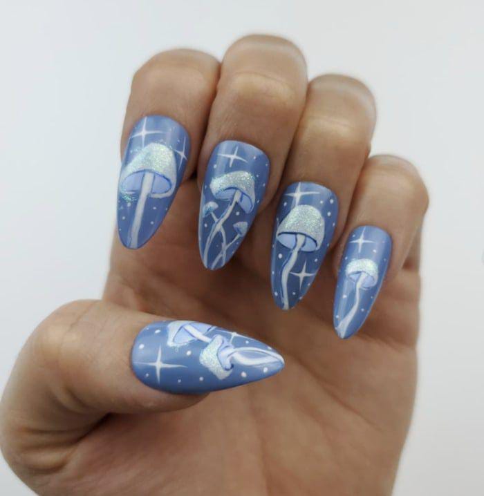 Bright blue nails decorated with stars and red mushrooms, blending magical forest imagery with a dreamy night-sky feel.