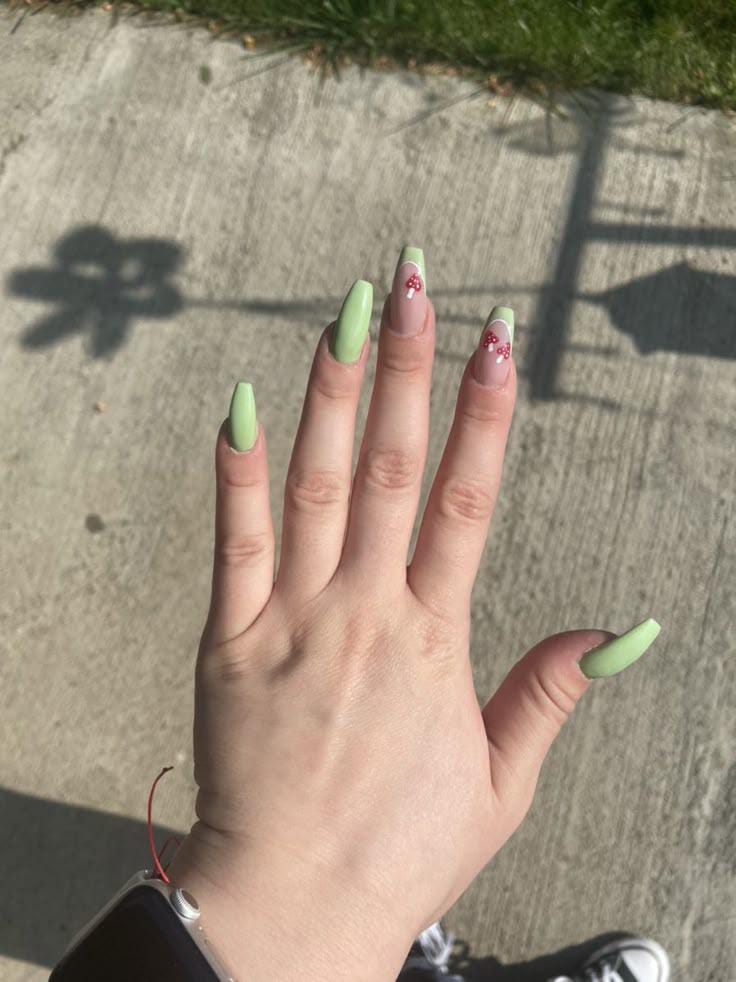 Soft pastel green nails paired with accent nails featuring tiny red mushrooms create a fresh, spring-inspired woodland look that feels playful yet minimal.