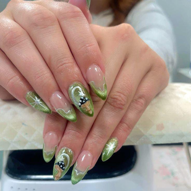 Shimmery green tips flow like moss around nude nails, accented with whimsical mushroom designs that feel earthy and enchanting.