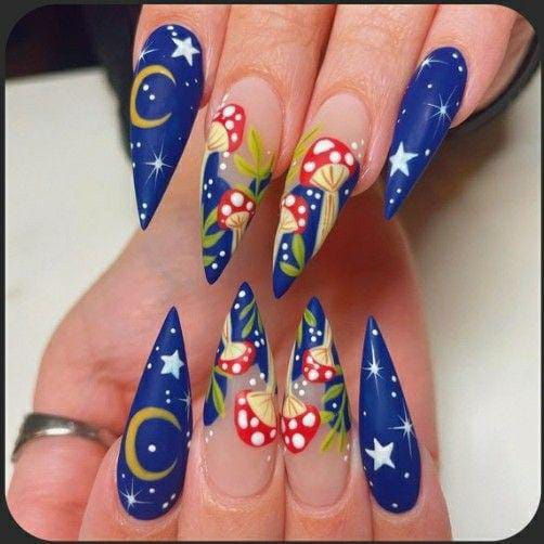 A bold navy blue base adorned with golden moons, stars, and bright mushrooms creates a dreamy, celestial fantasy look full of mystery and charm.