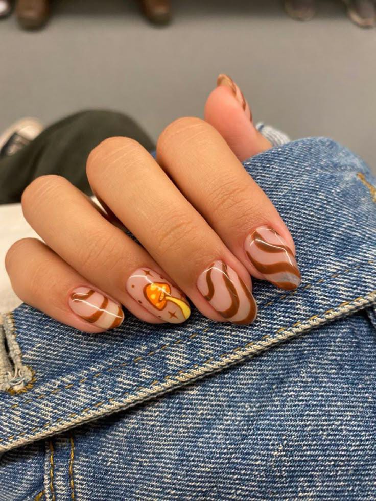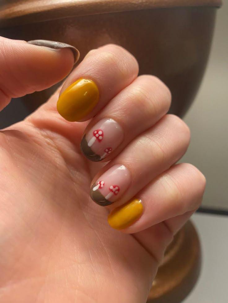 Warm mustard tones mix with earthy brown French tips and tiny mushroom details, capturing the cozy essence of fall in a simple, rustic way.