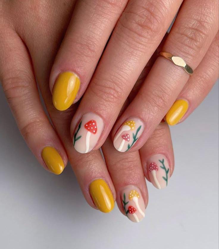 A cheerful mix of bright yellow nails paired with soft nude bases, decorated with whimsical red and yellow mushrooms and leafy green stems.
