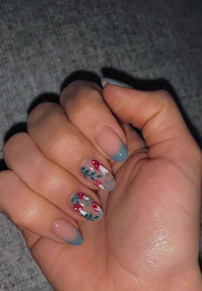 Soft nude nails with muted blue French tips and accent nails featuring tiny red mushrooms and leafy branches, giving a whimsical woodland vibe.