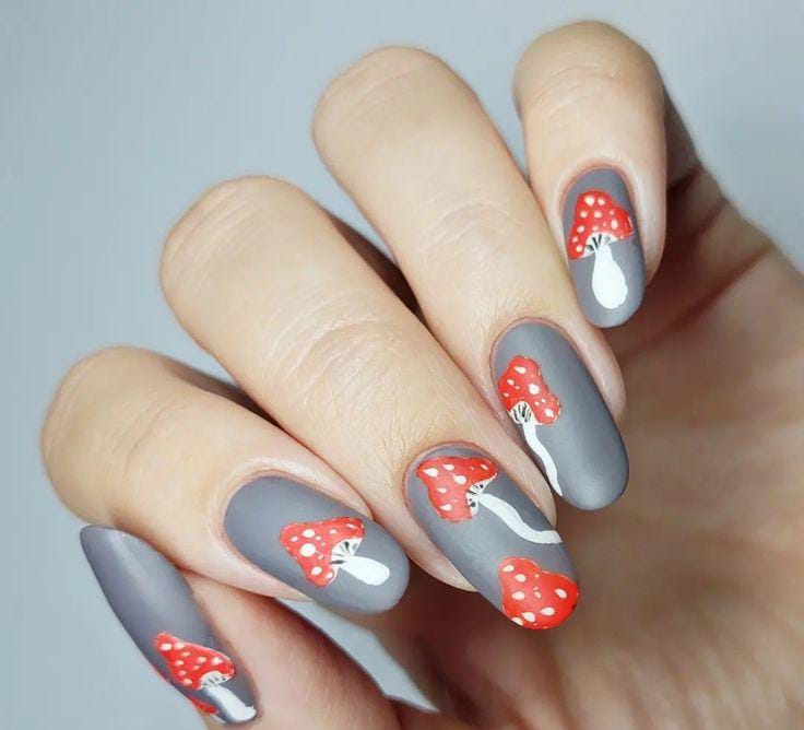 Matte grey nails with bold red mushrooms painted in detail, standing out as a clean yet striking forest-inspired design.