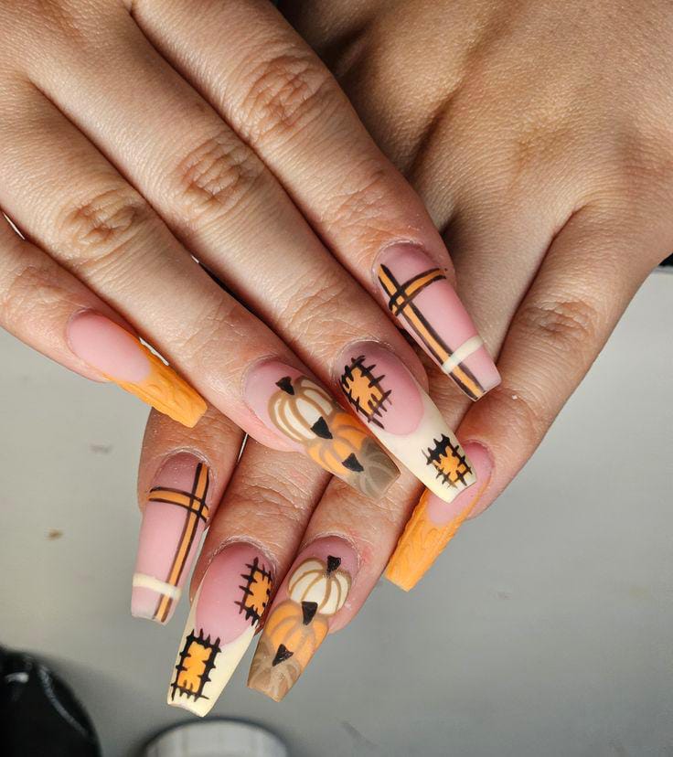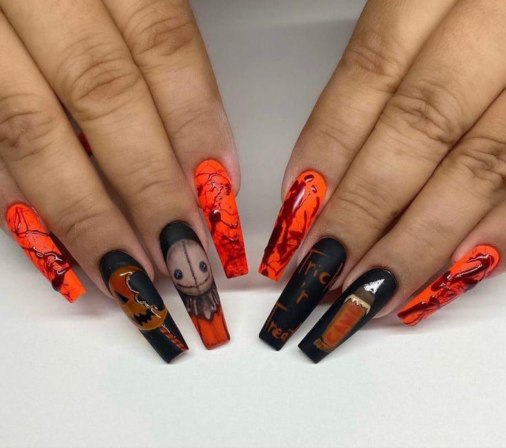 Blazing red blood splatter over orange nails meets matte black, with spooky characters and Halloween elements that lean more into horror, making it a fiery, eerie twist on the theme.