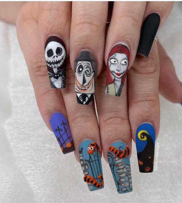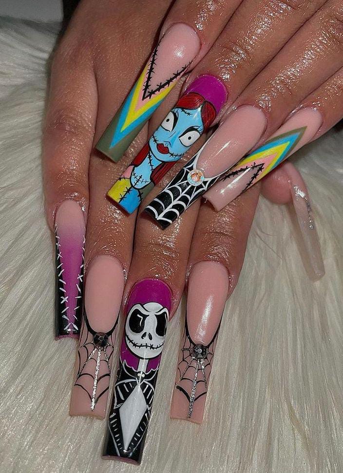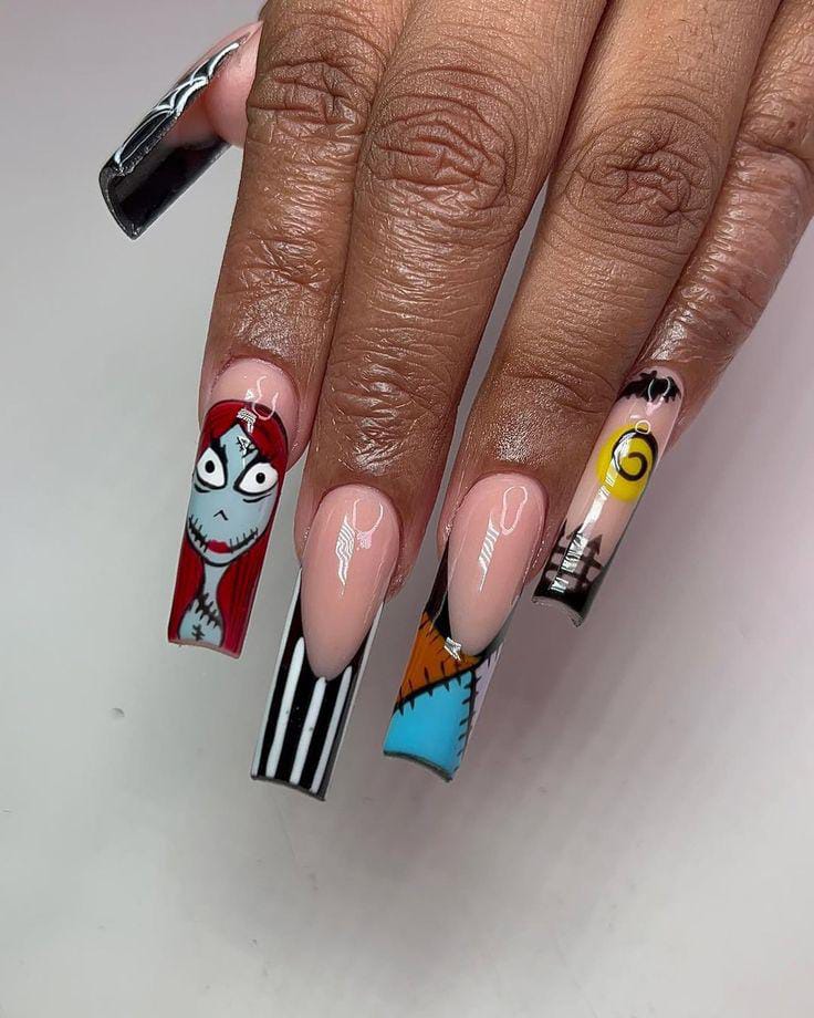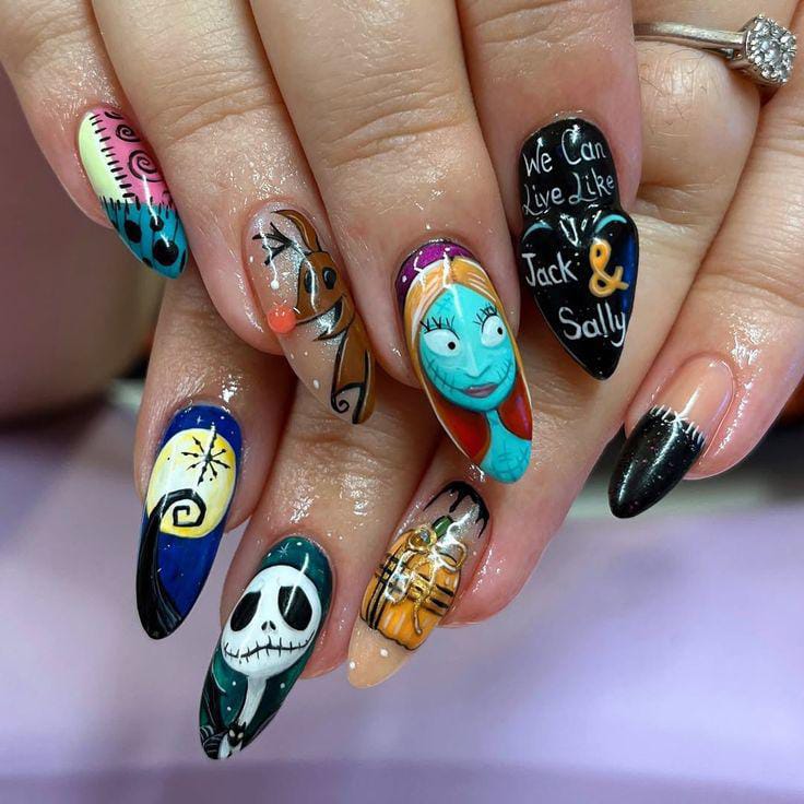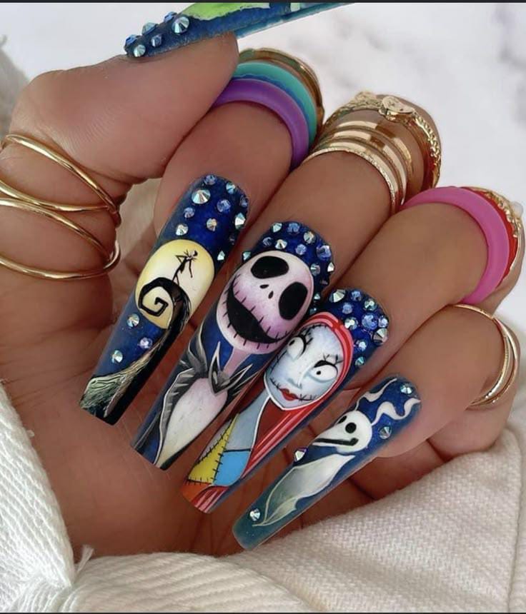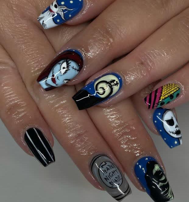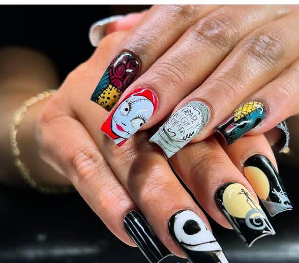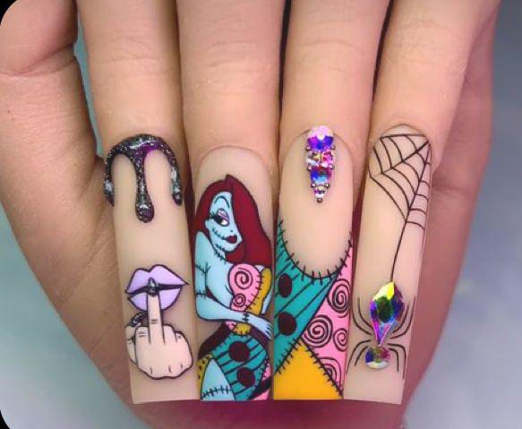 These nails showcase vibrant, cartoon-style art with Sally, stitched patterns, and bold outlines. The cheeky and expressive designs give a rebellious, playful twist.