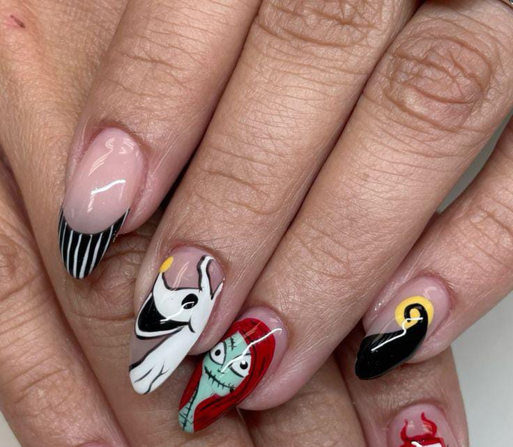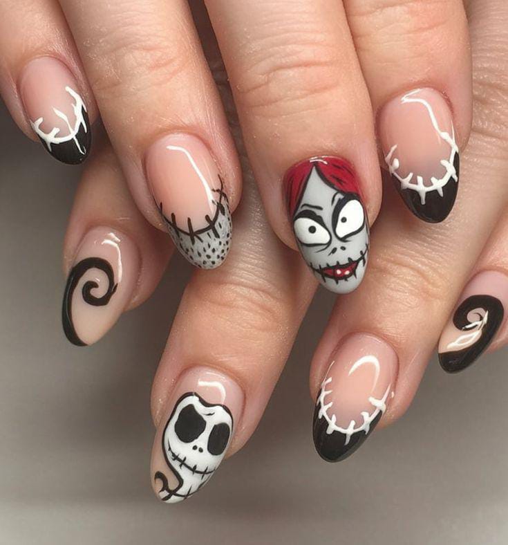 With a soft nude base and fine black-and-white detailing, this design keeps things edgy yet minimal, featuring stitched patterns and expressive Sally and Jack art on almond-shaped nails.