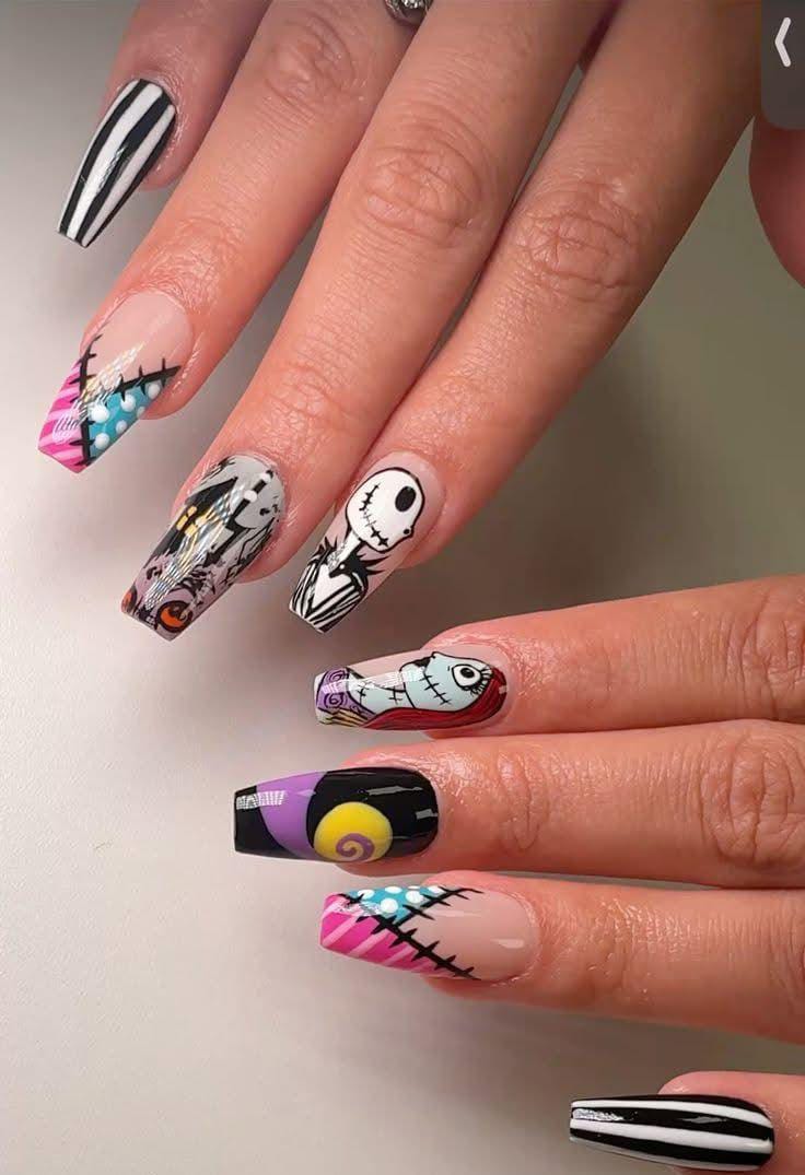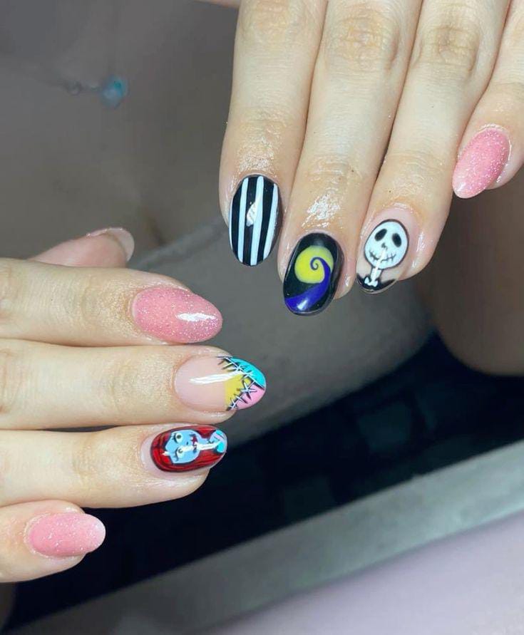A colorful mix-and-match design with glittery pink nails paired with bold Nightmare Before Christmas icons, this style brings a fun, quirky energy to classic Sally themes.
