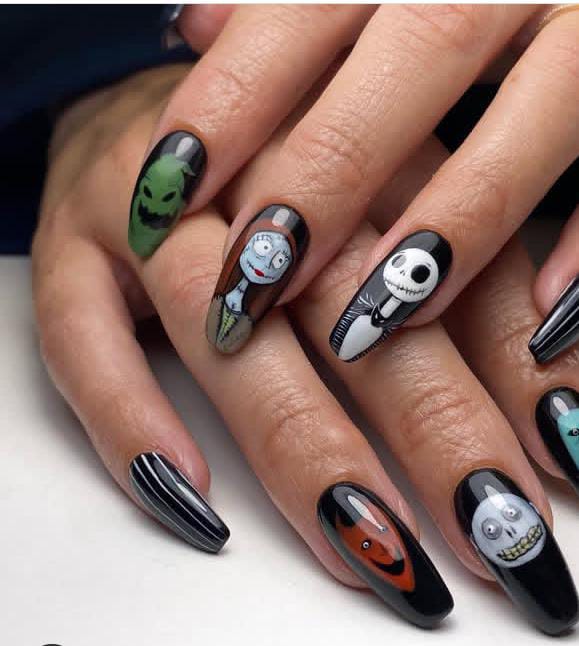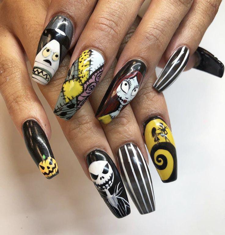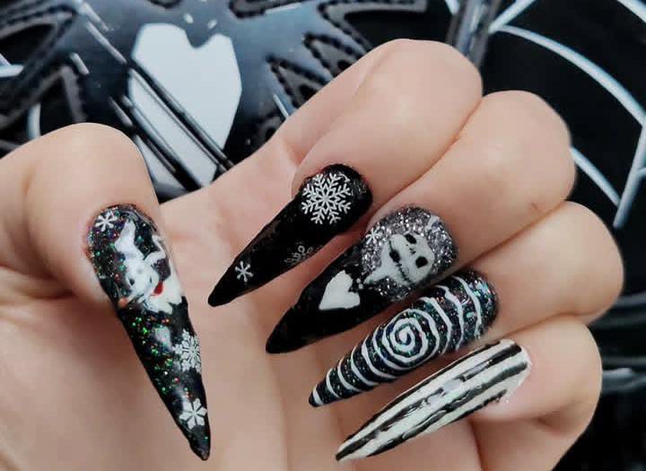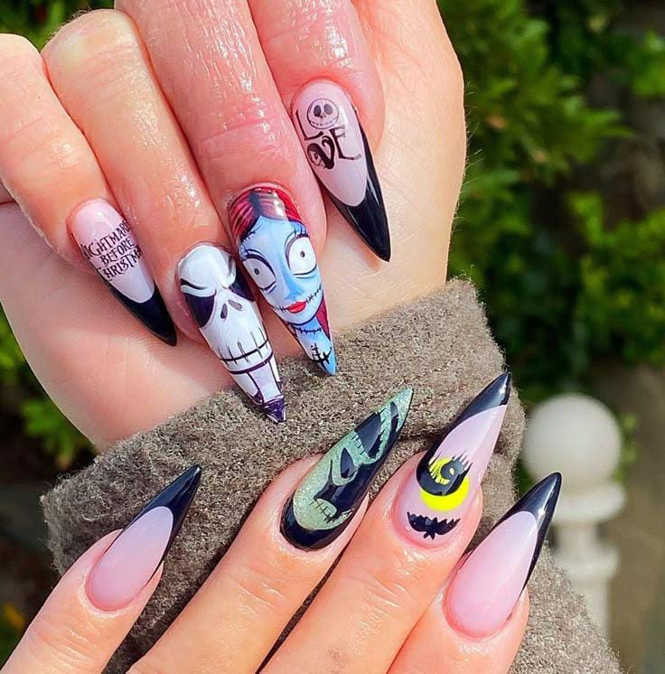 With sharp black French tips and surreal illustrations of Jack and Sally, this design is bold, dramatic, and full of gothic flair.