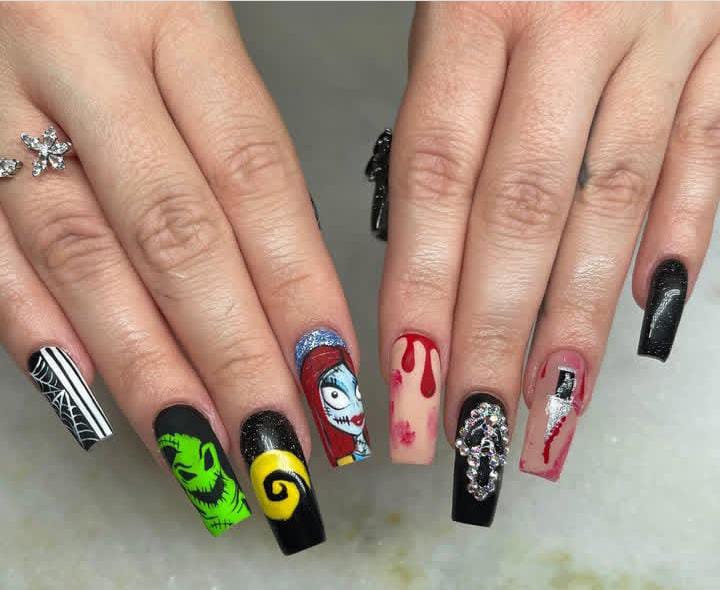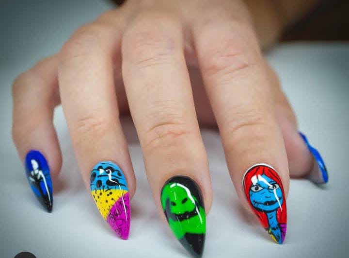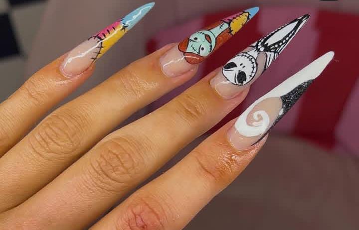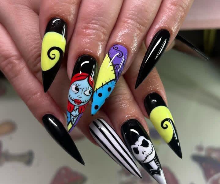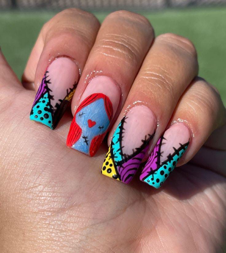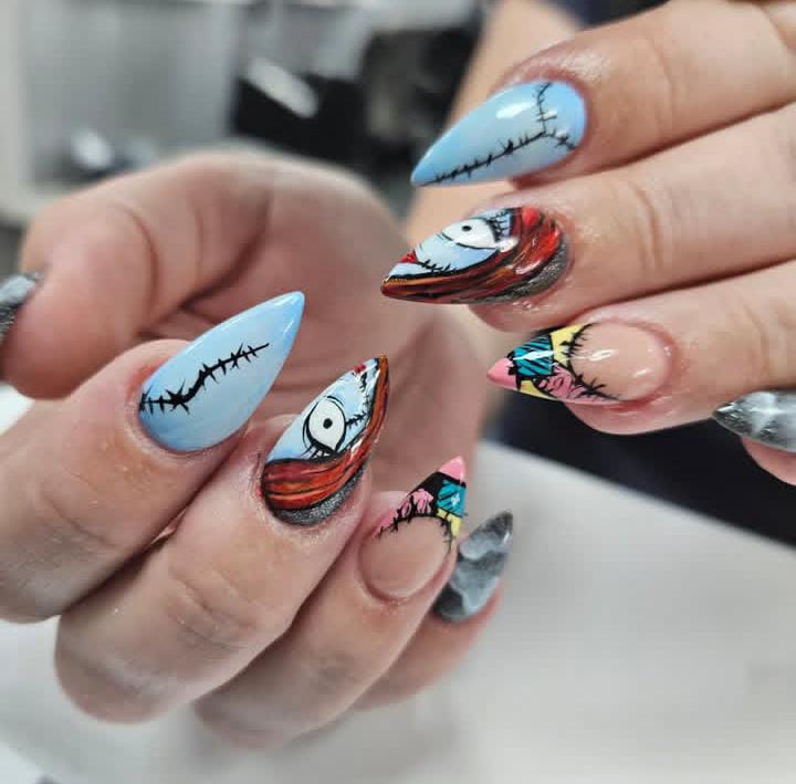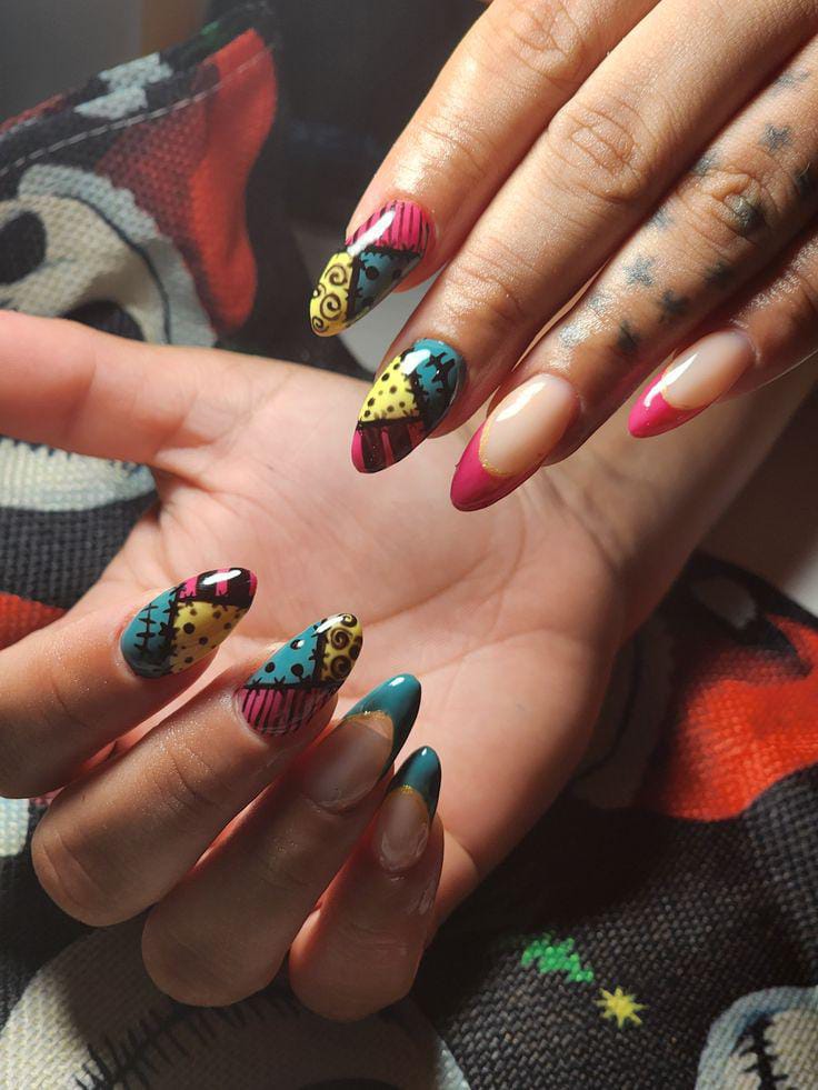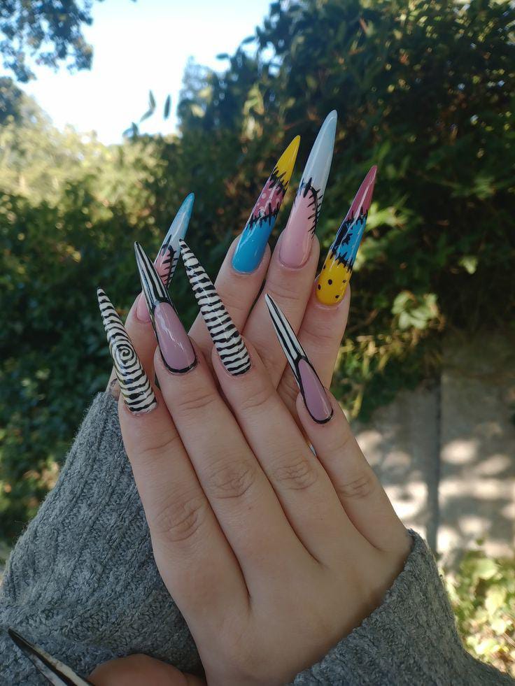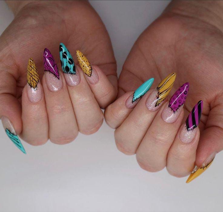 Each nail mimics a piece of Sally’s patchwork dress with distinct patterns and colors. The sharp, stiletto shape adds a clean and artistic finish to the look.