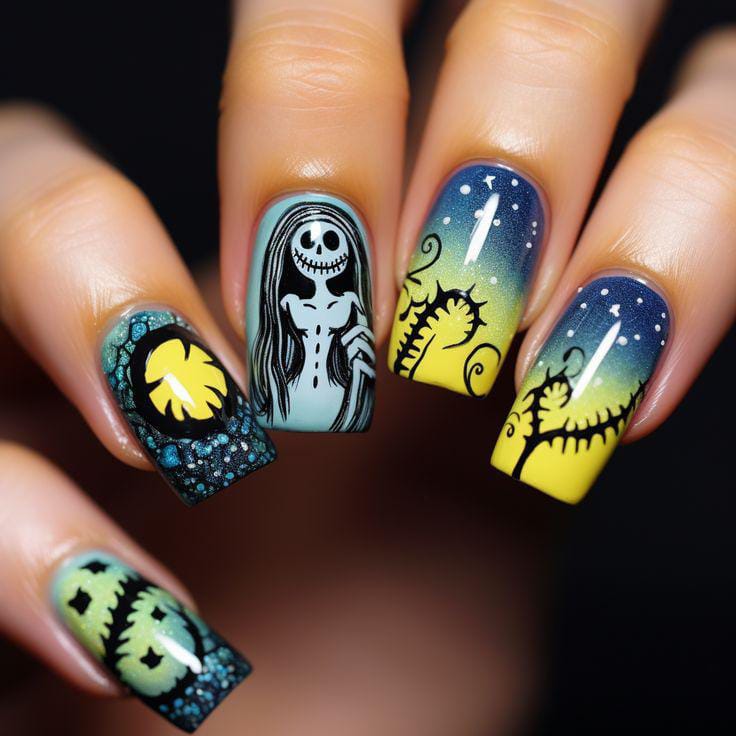 With a soft gradient from deep blue to yellow, these nails feature silhouette art and a haunting Jack-like Sally figure. The dreamy background gives it a mysterious, nighttime charm.