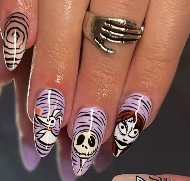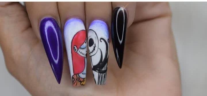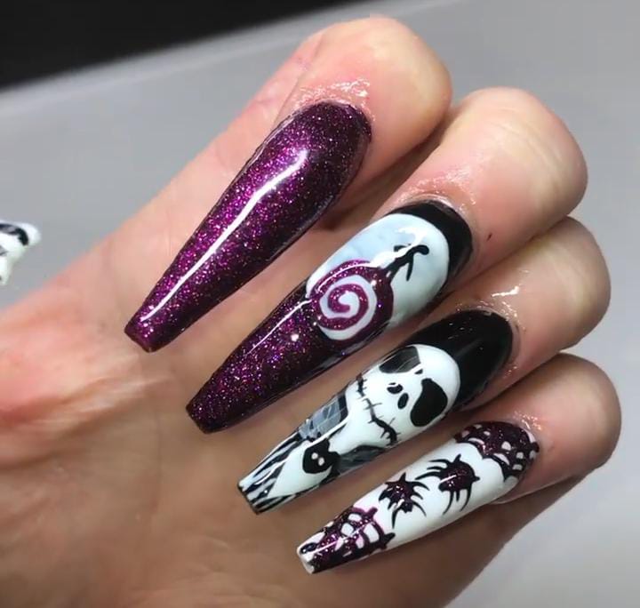 This design blends deep purple glitter with black and white Jack, Sally-themed art and spider webs. It’s dark, dramatic, and perfect for a glam goth look.