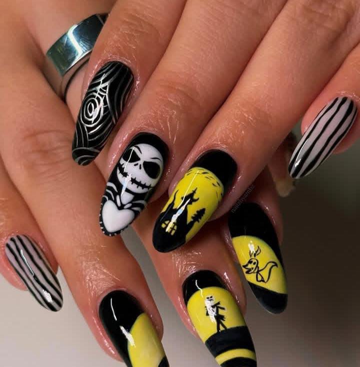 This nail art uses high-contrast black, yellow, and white to create striking silhouettes of Jack, Zero, and spooky scenery.