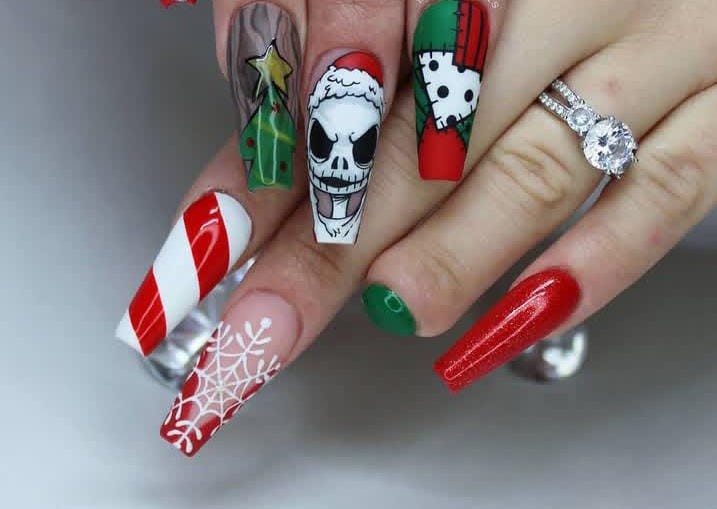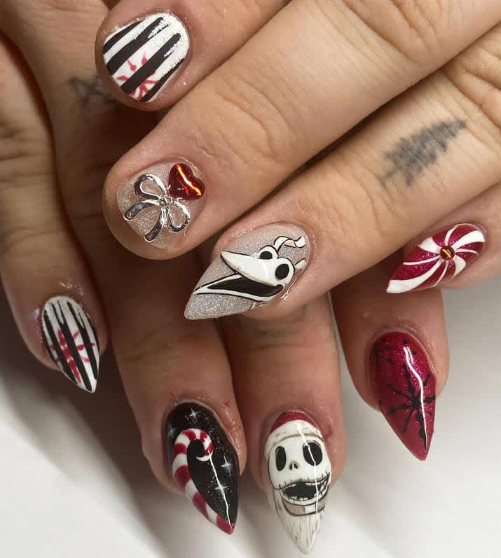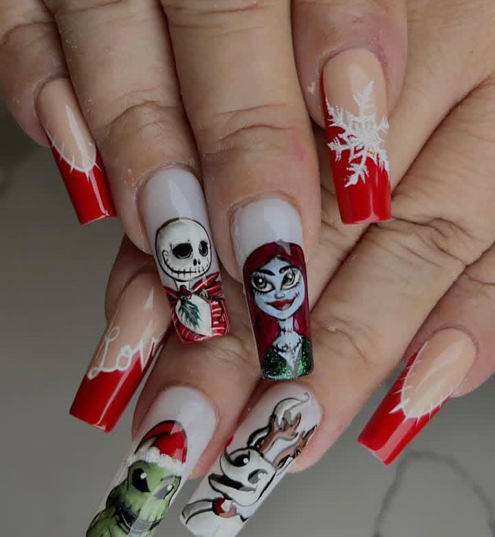 A festive blend of red French tips, snowflakes, and Nightmare characters like Jack, Sally, and Zero dressed for Christmas.