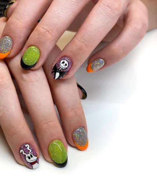A playful mix of glitter, neon green, and Halloween accents, with Jack and Zero bringing the spooky charm on rounded nails. The orange and black French tips add a festive, fun vibe.