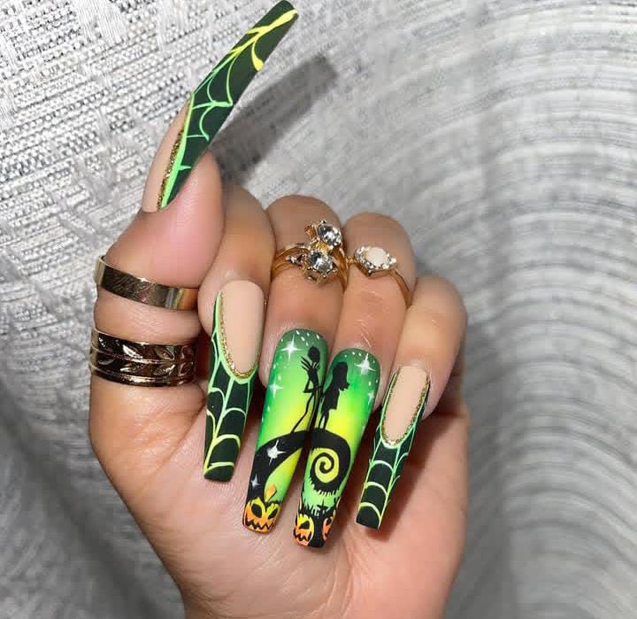 Long coffin nails with a glowing green and black ombré backdrop, featuring Sally and Jack’s iconic hilltop silhouette. Spiderwebs and pumpkins enhance the eerie fairytale aesthetic.