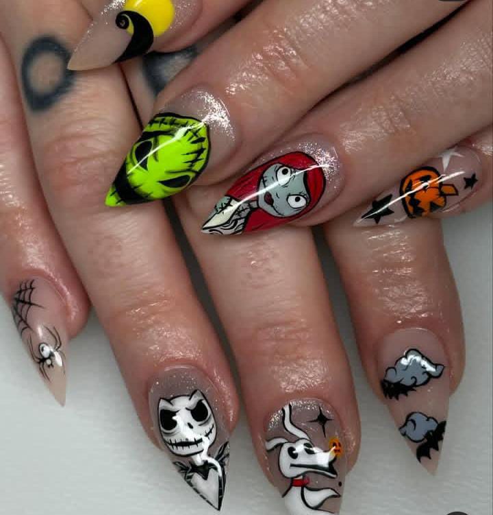 Glossy stiletto-shaped nails with a collage of all the favorites—Jack, Sally, Zero, Oogie, and spooky symbols—on a neutral base, blending Halloween horror with cartoon cuteness.