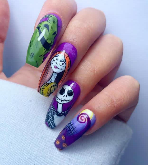 These long nails are wrapped in vibrant purples, showcasing Sally, Jack and Oogie Boogie in bold, detailed art.