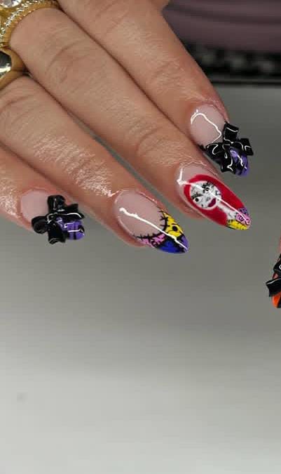 Glossy almond nails combine Sally’s patchwork patterns with chic black 3D bows, creating a girly-meets-ghoul aesthetic that’s fashion-forward and fun.