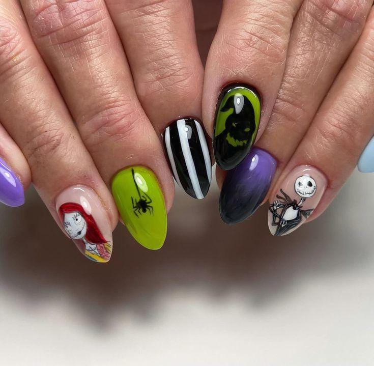 Bright and edgy with sharp stiletto nails, this set pops with vivid blues, greens, and purples, featuring detailed faces of Sally, Jack, Oogie Boogie, and more in a comic-style look.