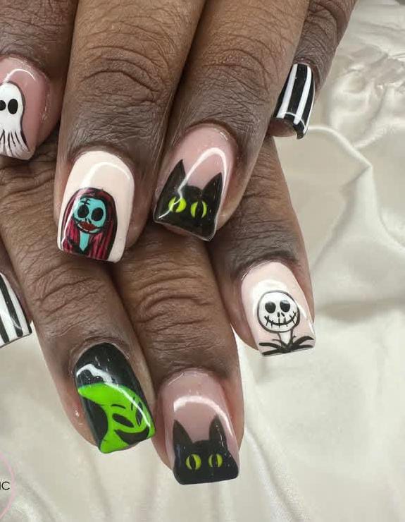 These shorter square nails combine cute and quirky Halloween vibes, with cartoonish artwork of Sally, Jack, and other spooky icons, set against a soft nude background.