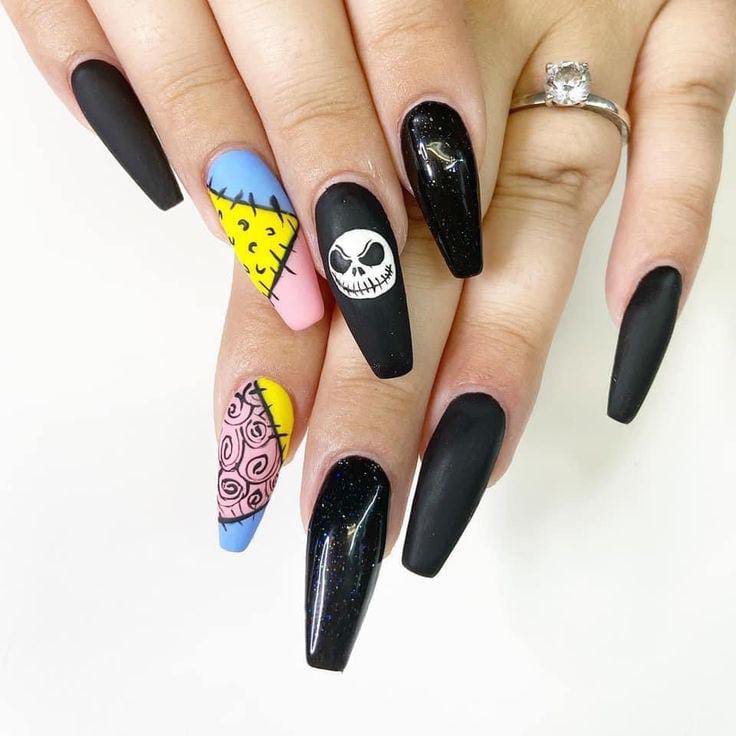 This set pairs bold matte black nails with bright pops of Sally’s iconic patchwork in pink, yellow, and blue, alongside Jack’s skull face for a striking contrast.