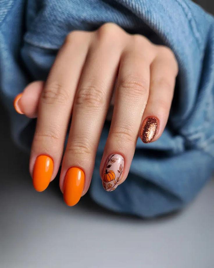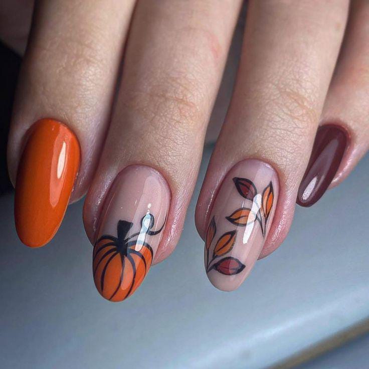 Bold pumpkins and crisp autumn leaves pop against nude and rich orange tones, giving these nails a rustic yet modern November charm.