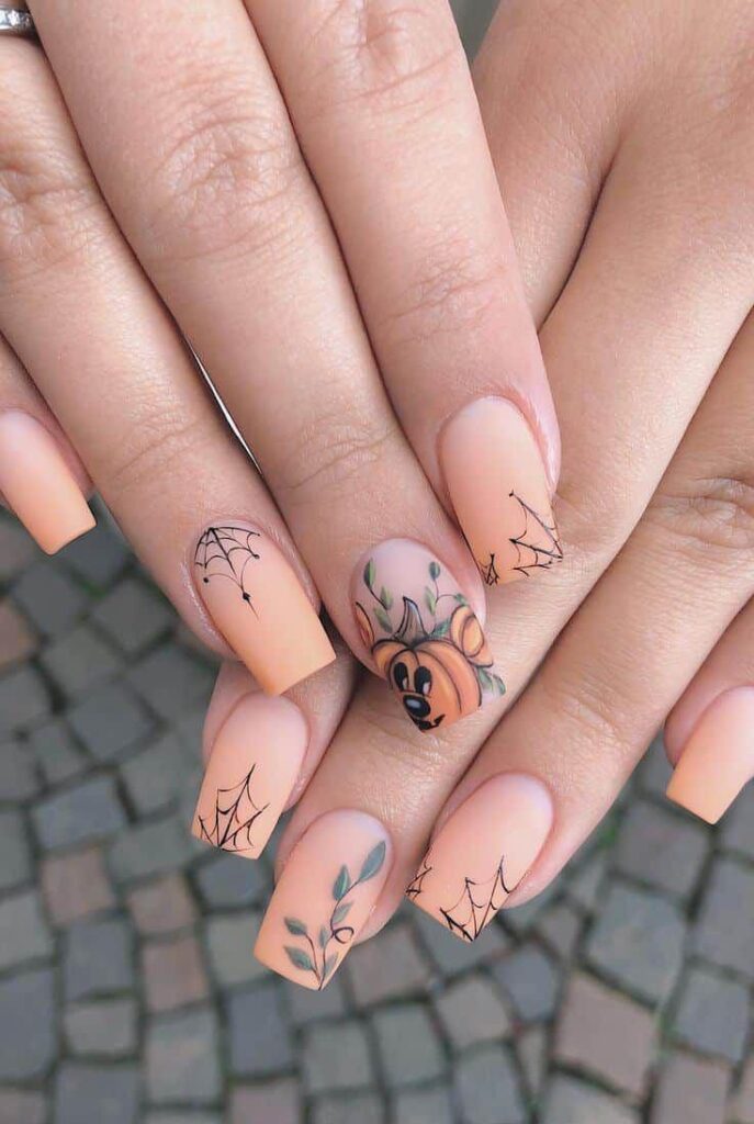 Matte peach nails with spiderweb accents and a cute pumpkin character create a playful yet seasonal design ideal for fall festivities.