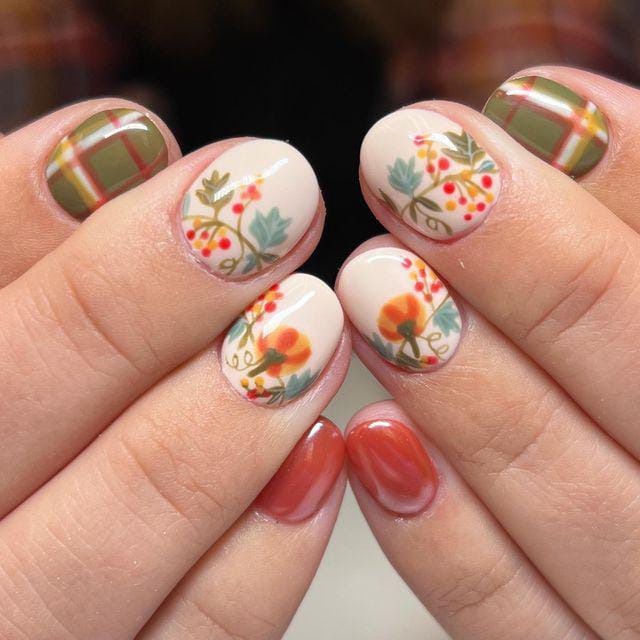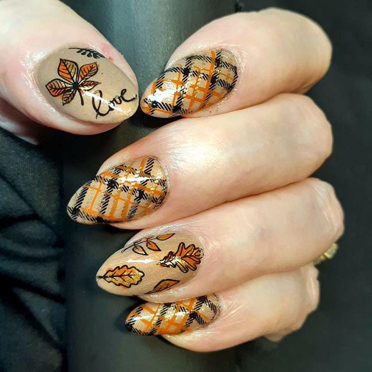 Warm beige nails patterned with orange plaid and scattered autumn leaves capture the timeless essence of fall fashion and November’s crisp air.