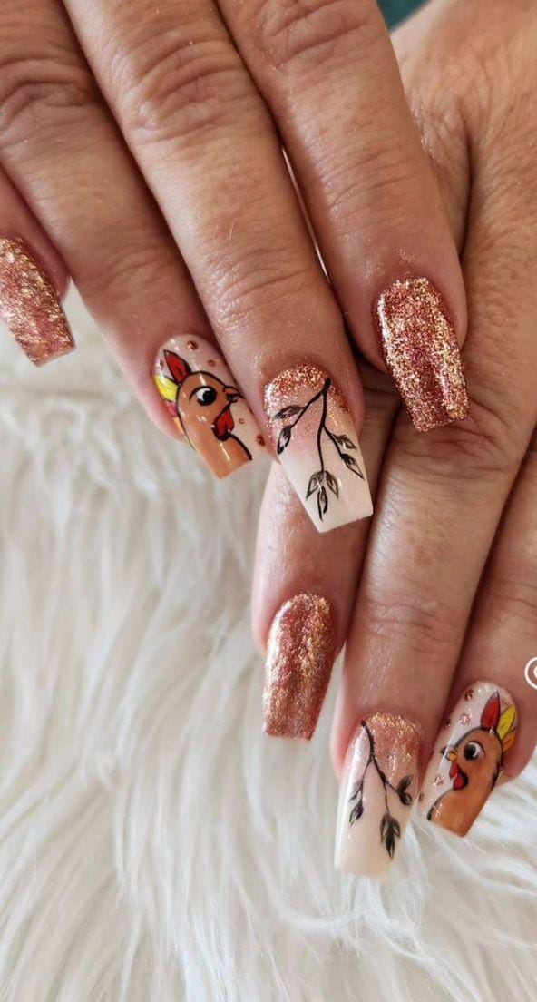 Glittery copper tones mixed with leafy branches and a playful turkey accent nail bring a festive Thanksgiving feel to this design.