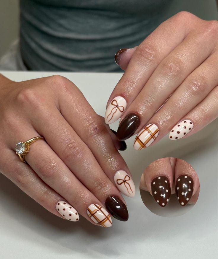 A mix of chocolate brown, cream, plaid, bows, and polka dots blend into a cozy sweater-like nail art that feels perfectly suited for November warmth.