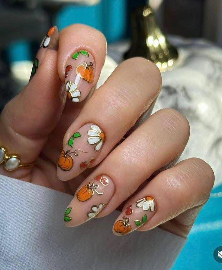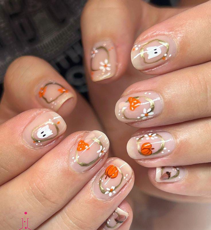 Soft nude nails decorated with tiny pumpkins, daisies, and whimsical ghost accents outlined in gold, bringing a cute and delicate November feel.