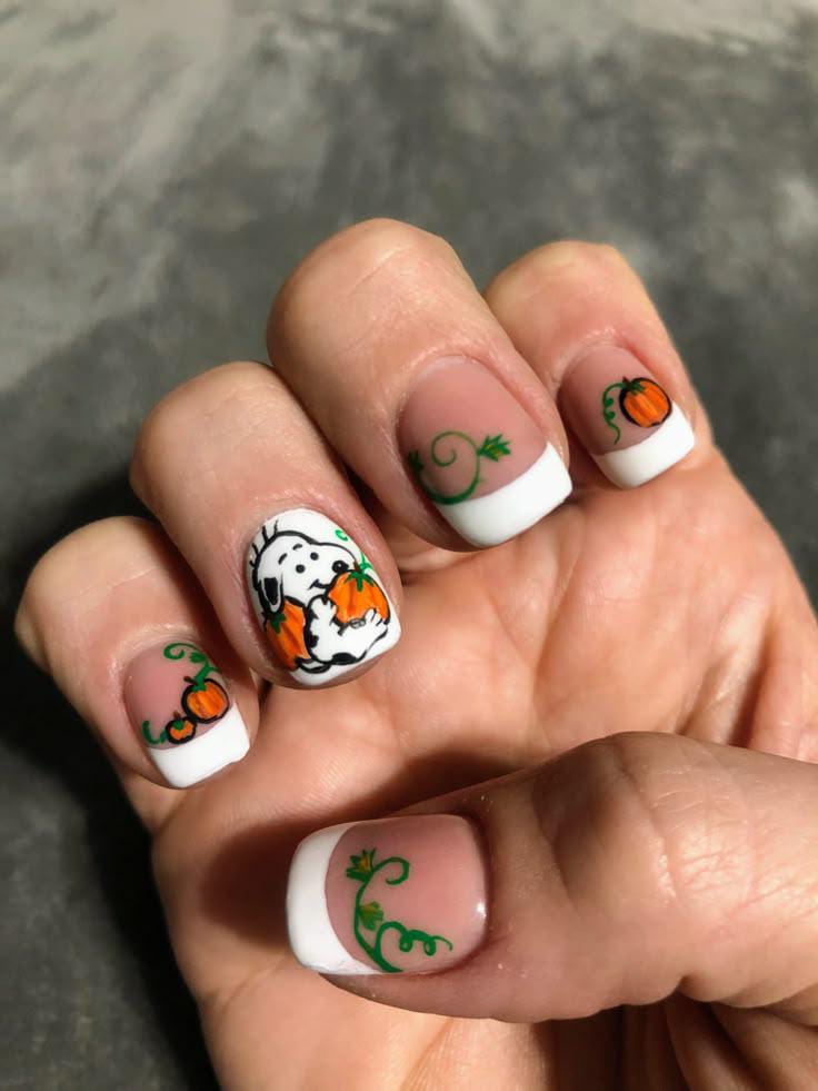 Playful white French tips decorated with pumpkins, green vines, and an adorable Snoopy character hugging his pumpkin. A cheerful, festive look that balances fun with seasonal charm.