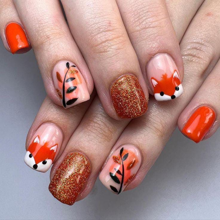 Bright orange fox faces paired with glittery copper nails and leafy accents make this design cozy yet striking. It’s a bold November look that captures woodland magic and autumn sparkle.