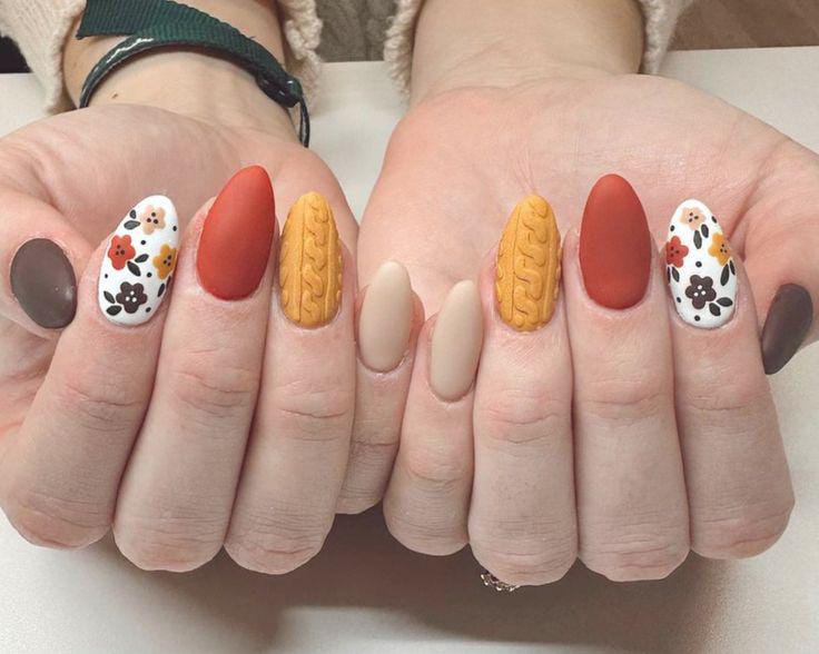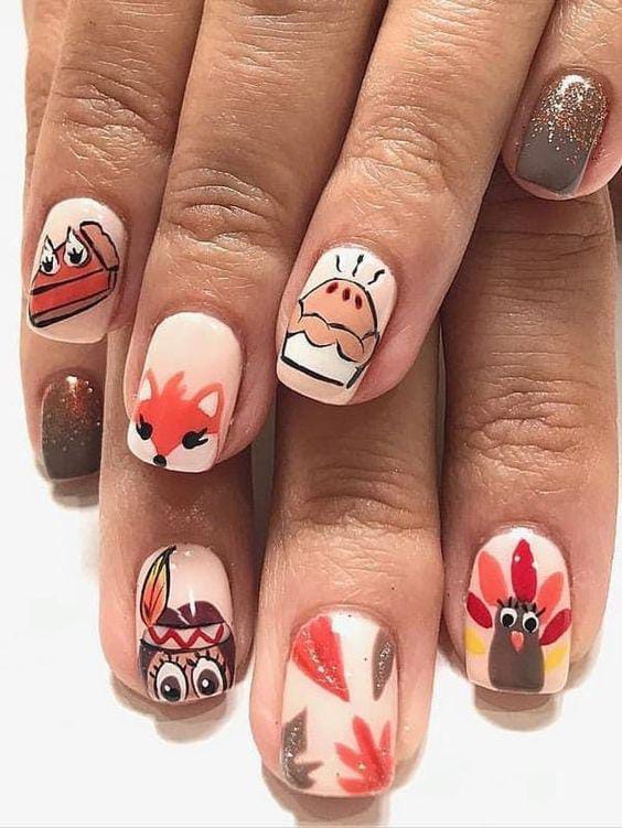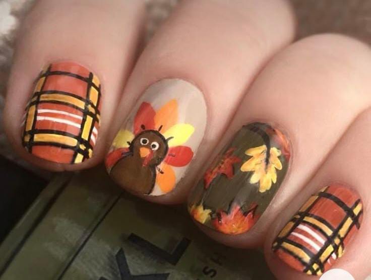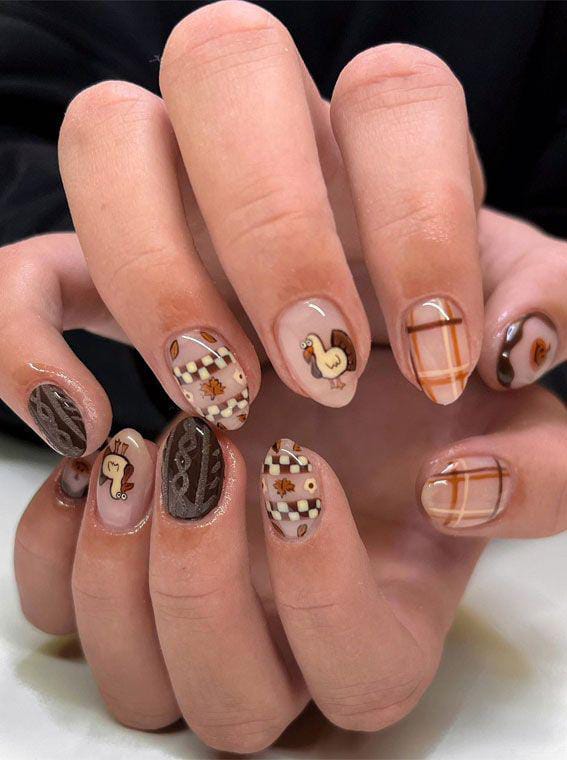 These nails capture the cozy spirit of November with warm shades of brown, beige, and cream, decorated with cute turkeys, fall leaves, and plaid patterns.