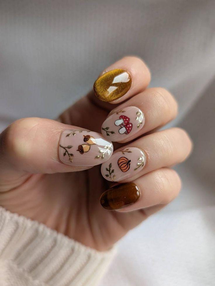 Deep brown nails decorated with daisies, mushrooms, and golden florals give a whimsical woodland vibe, perfect for cozy November days.