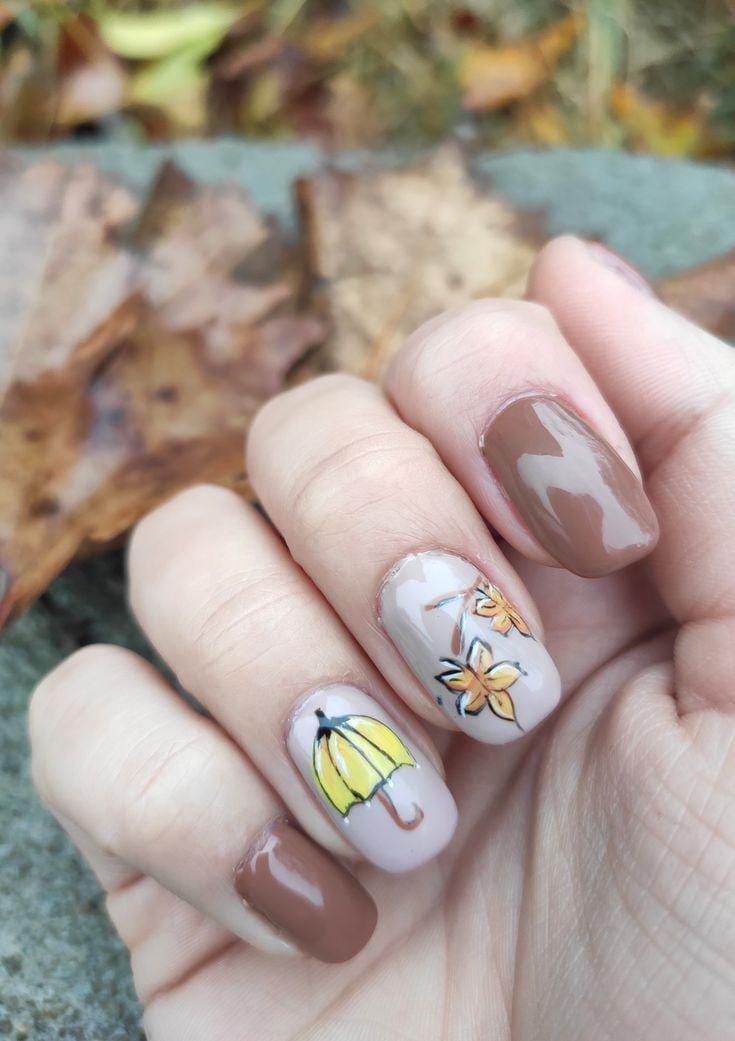 Earthy brown tones mixed with a yellow umbrella and delicate fall leaves bring a cozy, rainy-day November feel. It’s a simple yet elegant, seasonal touch.